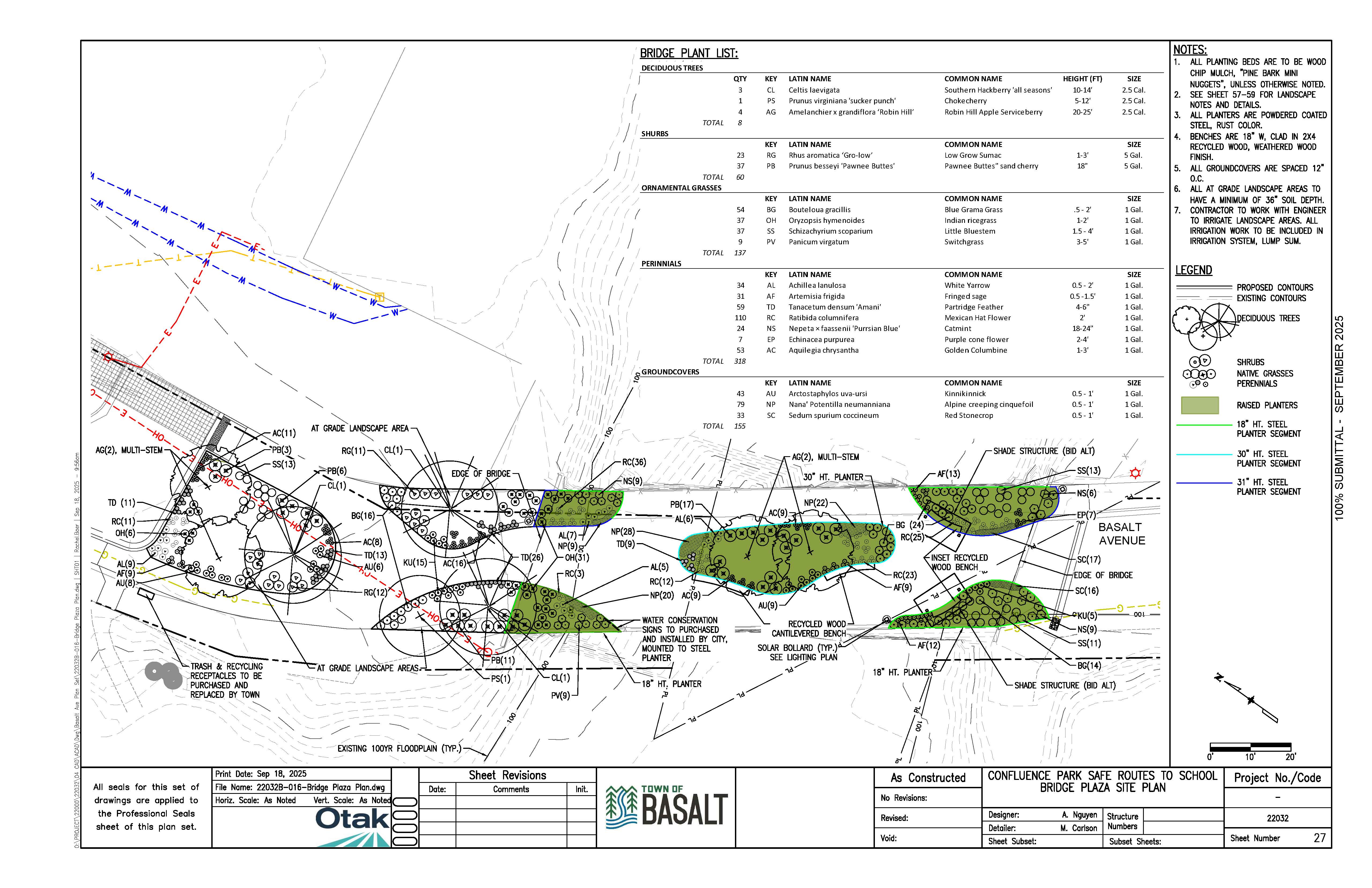 Guided by the goals stated above, Town staff and the design team led by OTAK have advanced a design that addresses structural and drainage deficiencies on the Emma Bridge, improves safety for the traveling public and schoolchildren, accommodates snow-removal operations, and creates a “park-on-a-bridge” experience overlooking the Roaring Fork River. Project elements include new or upgraded ADA-accessible sidewalks, pedestrian and bicycle safety improvements, enhanced landscaping and lighting, safer crosswalks, and modernized drainage infrastructure.